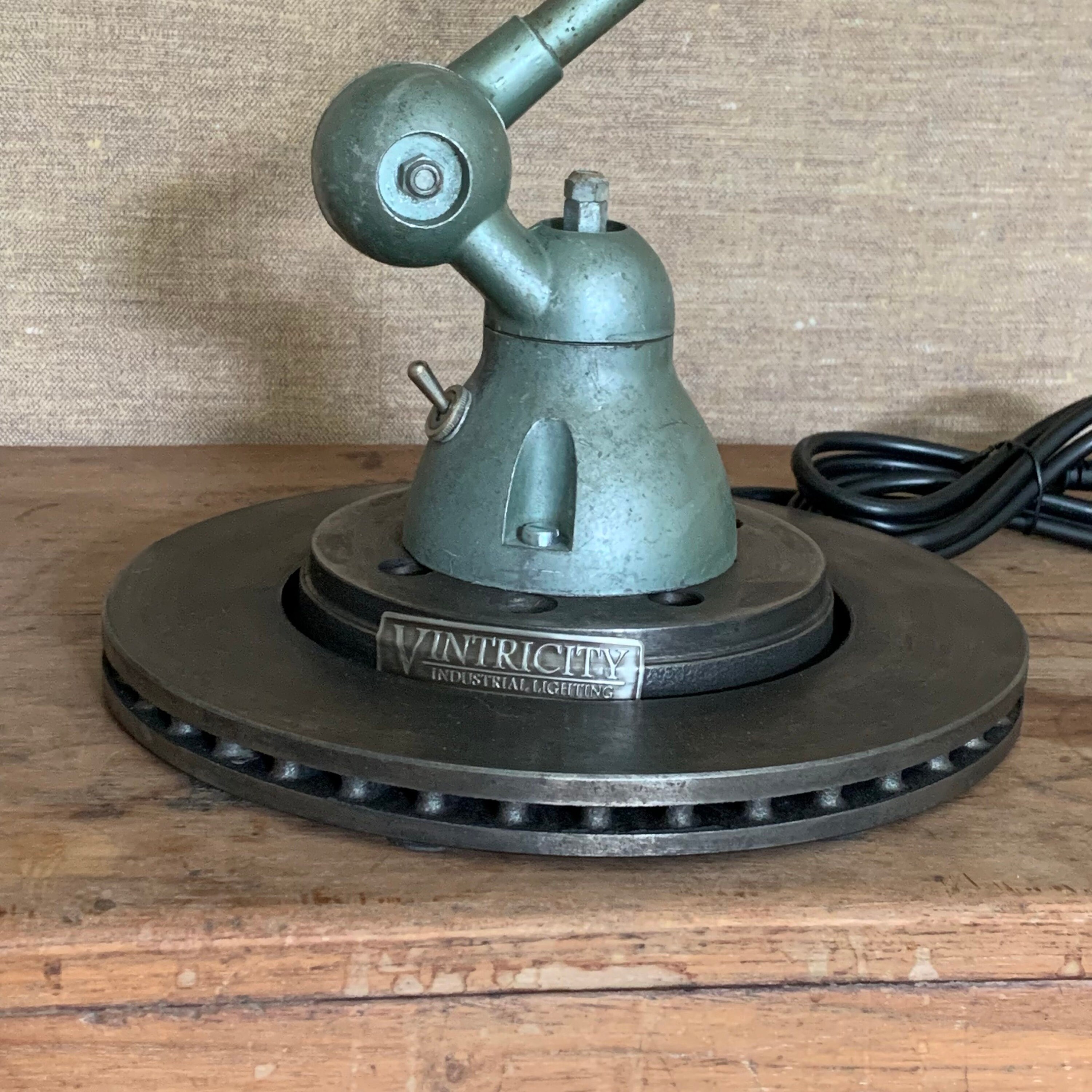 The lamp stands on a recycled brake disc. This has been stripped of rust, degreased and treated with a layer of Graphite Wax for a nice matching look. The bottom of the disc is equipped with 8 anti-slip pads. The wiring is professionally connected using terminal blocks (no loose terminal blocks!)
