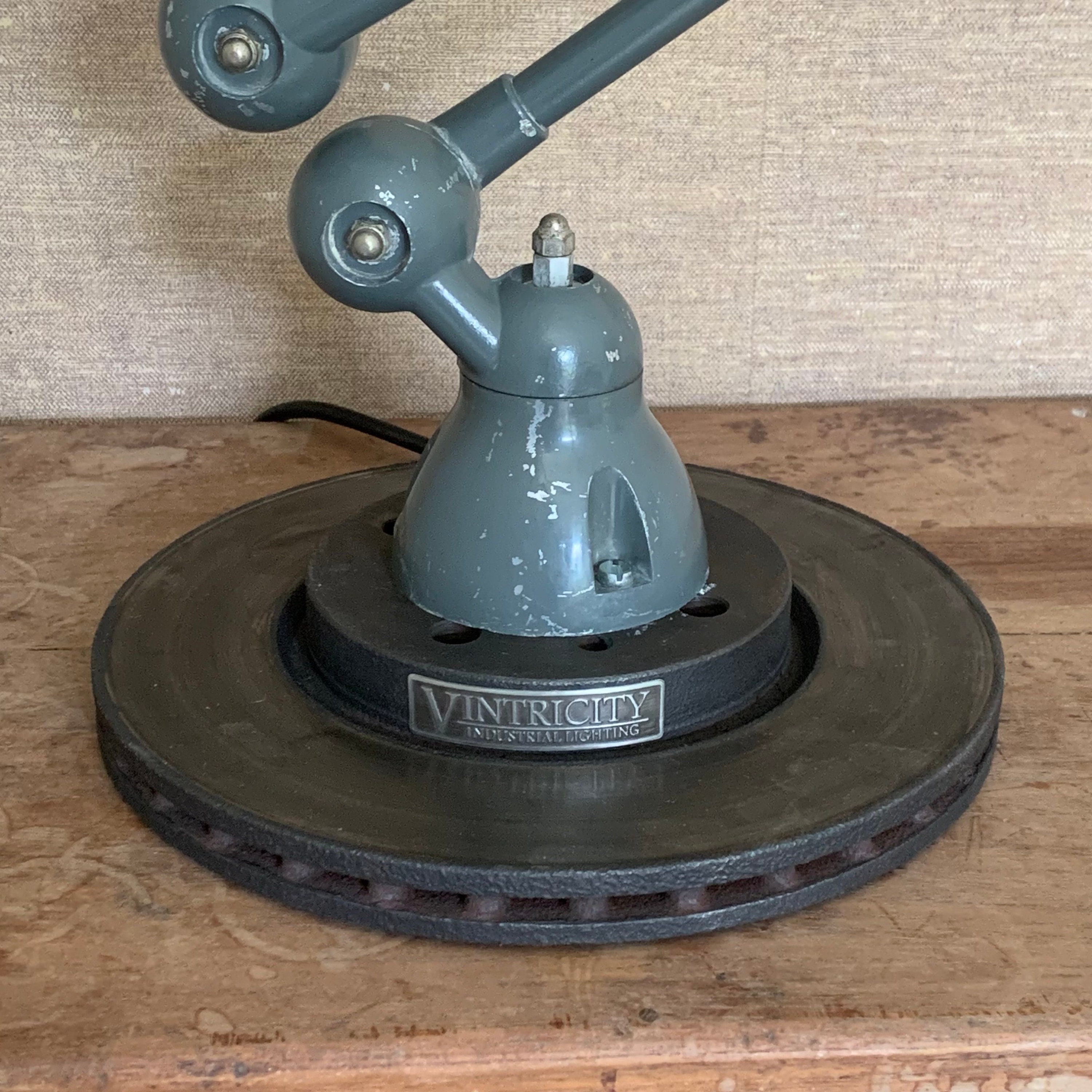 The lamp stands on a recycled brake disc. This has been stripped of rust, degreased and treated with a layer of Graphite Wax for a nice matching look. The bottom of the disc is equipped with 8 anti-slip pads. The wiring is professionally connected using terminal blocks (no loose terminal blocks!)